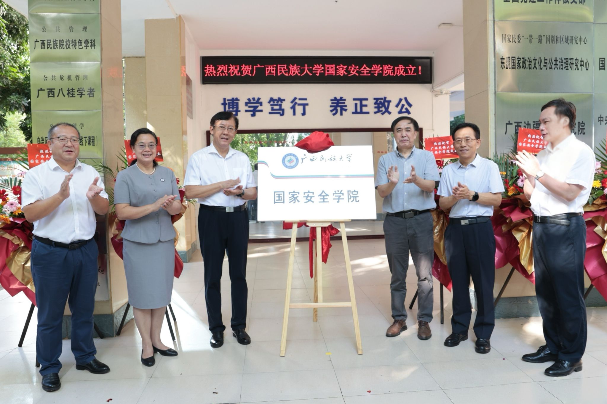 唐平秋、韦仕珍、姜明国、唐永胜、黄大慧及实践部门有关负责人一同为广西民族大学国家安全学院揭牌。