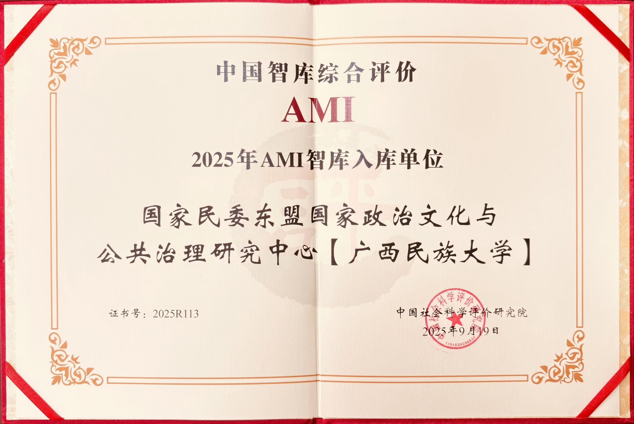 近日,中国社会科学评价研究院正式向各智库颁发“中国智库综合评价研究项目(2025)”AMI智库入库证书,m88明昇托管的国家民委东盟国家政治文化与公共治理研究中心【广西民族大学】(以下简称“中心”)成功入选“2025年AMI智库入库单位”,这一成果标志着中心智库建设迈上新台阶、实现新突破。