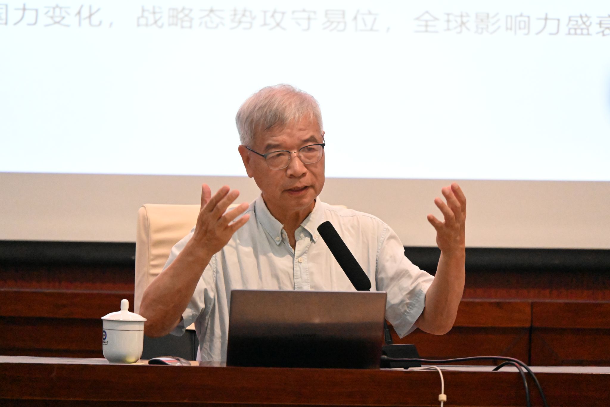黄仁伟教授以国际形势所面临的新阶段和转折点进行导入,基于中美力量结构优劣对比,分析中美全球战略重点的变化。他指出,美国全球战略重点从大西洋到中东,现正向印太地区转移,美国将经济全球化转变为地缘政治全球化,使得全球化“武器化”,我国面临认知战、科技战、关税战等安全威胁。我们要充分把握“数智经济”优势,追赶基础性创新,强化应用型创新,发挥体制优势,守好以能源安全和金融安全为关键的国家安全各领域,在以“攻守兼备”为特征的战略博弈新阶段“补足短板、练好内功、伺机突破”。