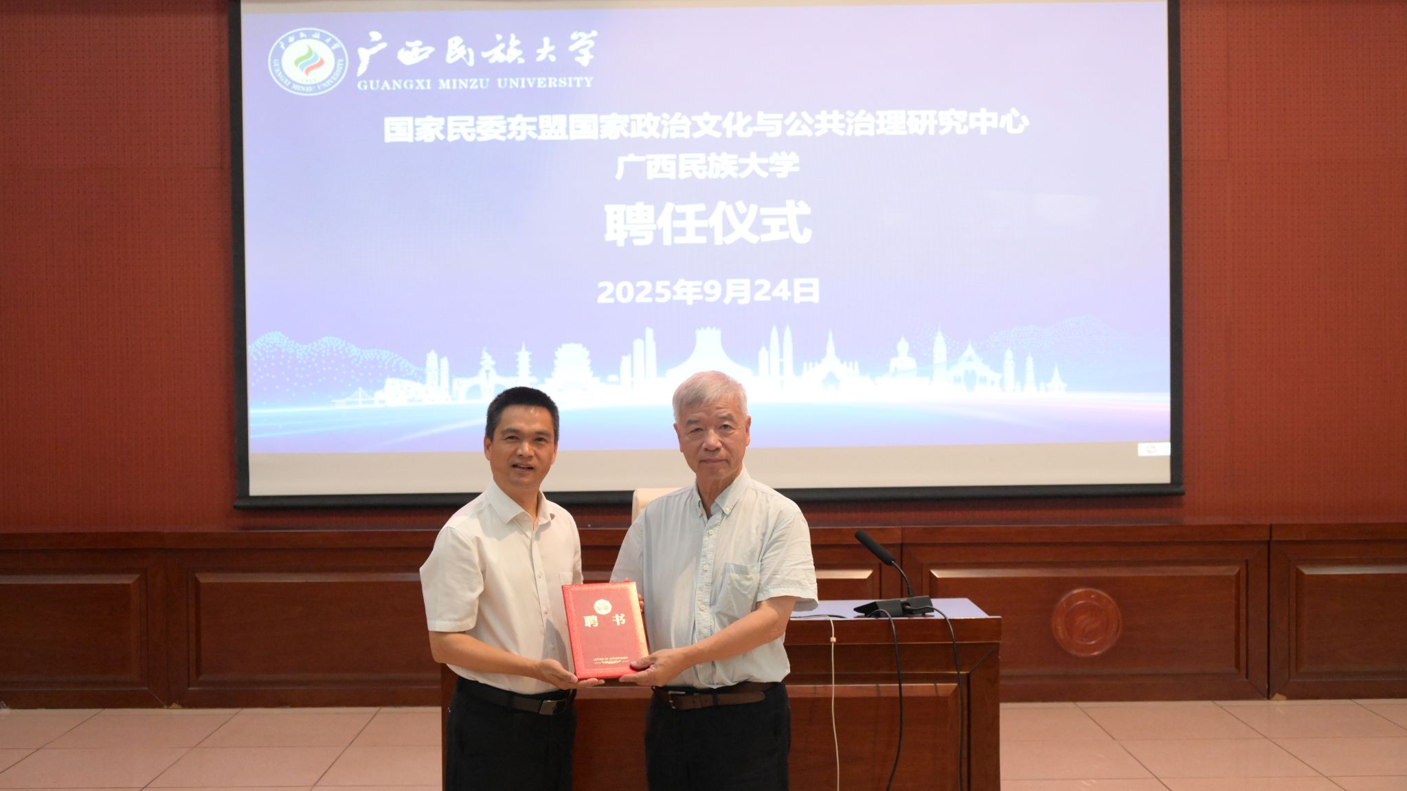 讲座开始前,国家民委东盟国家政治文化与公共治理研究中心主任叶兴艺教授为黄仁伟教授颁发了中心“特聘研究员”的聘书。