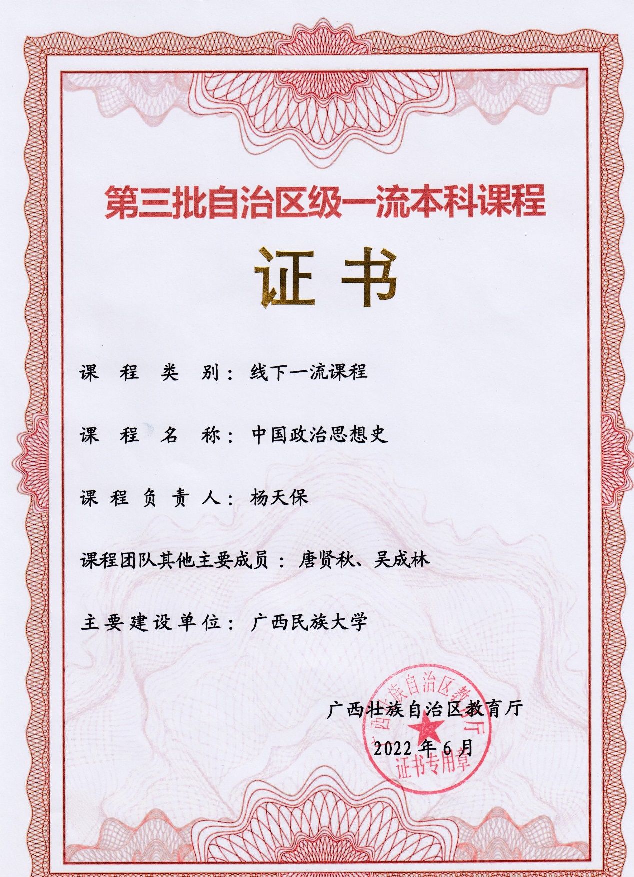 2022年6月,m88明昇《中国政治思想史》课程荣获第三批自治区级一流本科课程(线下)。该课程团队由杨天保教授、唐贤秋教授和吴成林副教授组成。《中国政治思想史》是政治学与行政学本科专业必修课程,一方面,它梳理中华民族五千年政治文明史的思想脉络,揭示中国政治思想史的发展规律,思想性强;另一方面,传统学问丰富,是治理国家、处理政治关系及促进政治发展的中国理论与中国方案的大汇聚。
