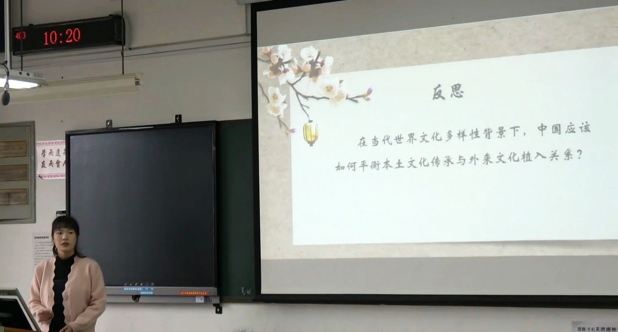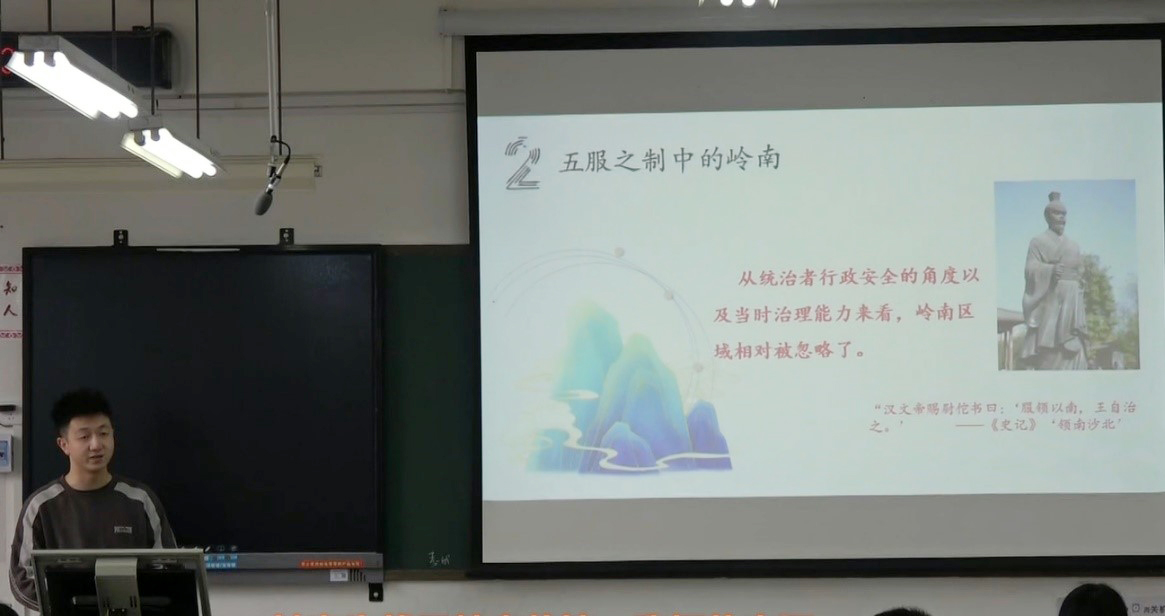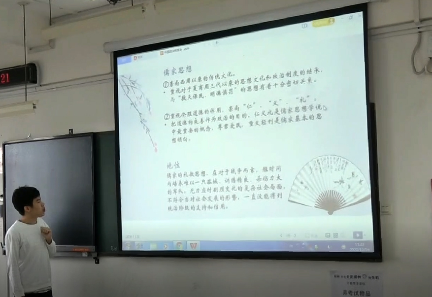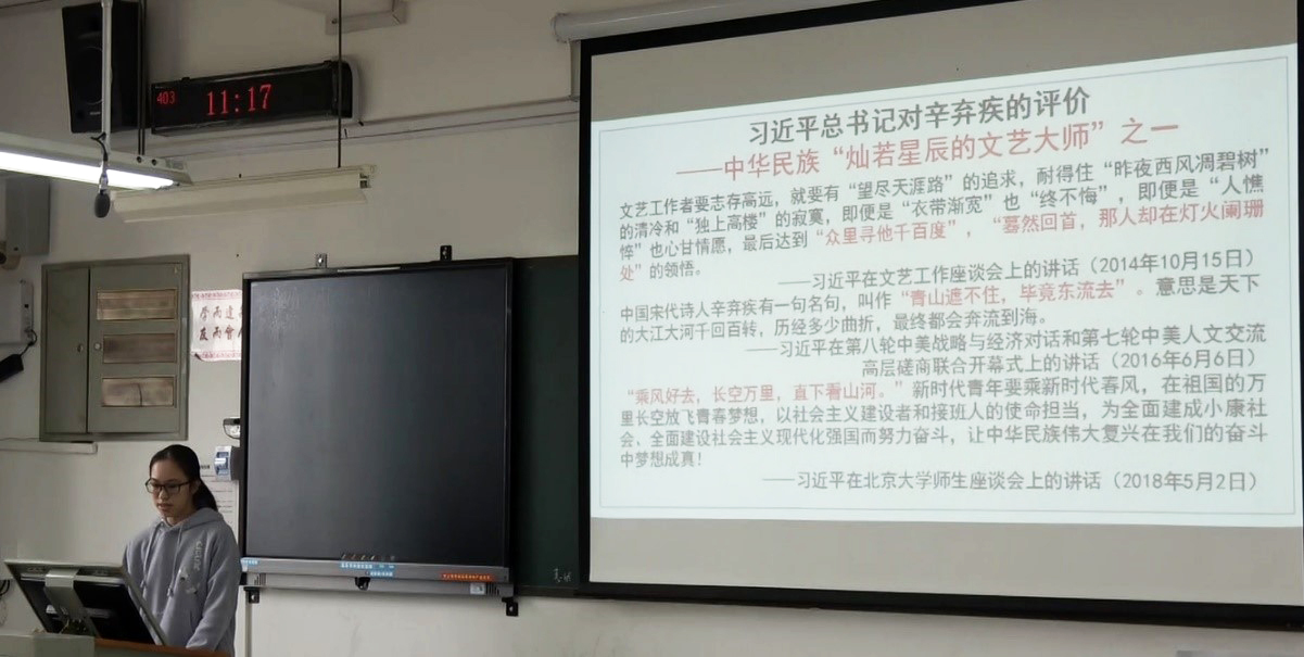 2021年12月24日上午第3-4节,本年度课程教学的压轴大戏如期在学友楼403室举行,近120多位师生参与分享《中国政治思想史》课外小组的学习成果。按照设计,3个教学班课外提前完成预选赛,各自挑选出2个优胜小组代表本班参与最终决赛。期间,共有6个小组、30位同学联手进入决赛,其题目分别是:《条约口岸知识分子》、《岭南之问》、《走进辛弃疾——文人眼中的将军,武将眼中的儒士,帝王眼中的儒将》、《“铄王师兮征荒裔,剿凶虐兮截海外”汉武帝时期的汉匈战争与儒道交锋》、《认识你自己》、《楚汉争霸也是儒法之争》。历经2小时的成果展演、学术交流与技术角逐,《岭南之问》以岭南思想家在教材中的数量为思考出发点探究“岭南学”建构的必要性,《“铄王师兮征荒裔,剿凶虐兮截海外”汉武帝时期的汉匈战争与儒道交锋》以儒道之争的视角再析汉匈战争的原因,先后以其思想性和创新性分别夺本年度冠、亚军。
