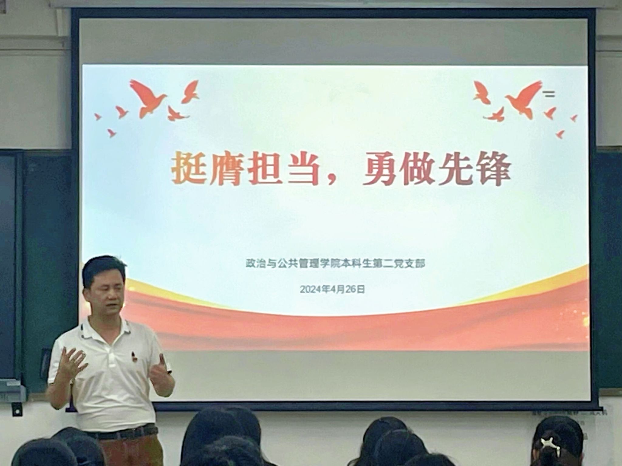4月26日晚,政治与公共管理学院本科生第二党支部于学友楼606室召开全国党建工作样板支部建设工作推进会。学院党委副书记、纪委书记黄琳富到会指导。会议由支部书记农植媚主持,全体支部同志参会。