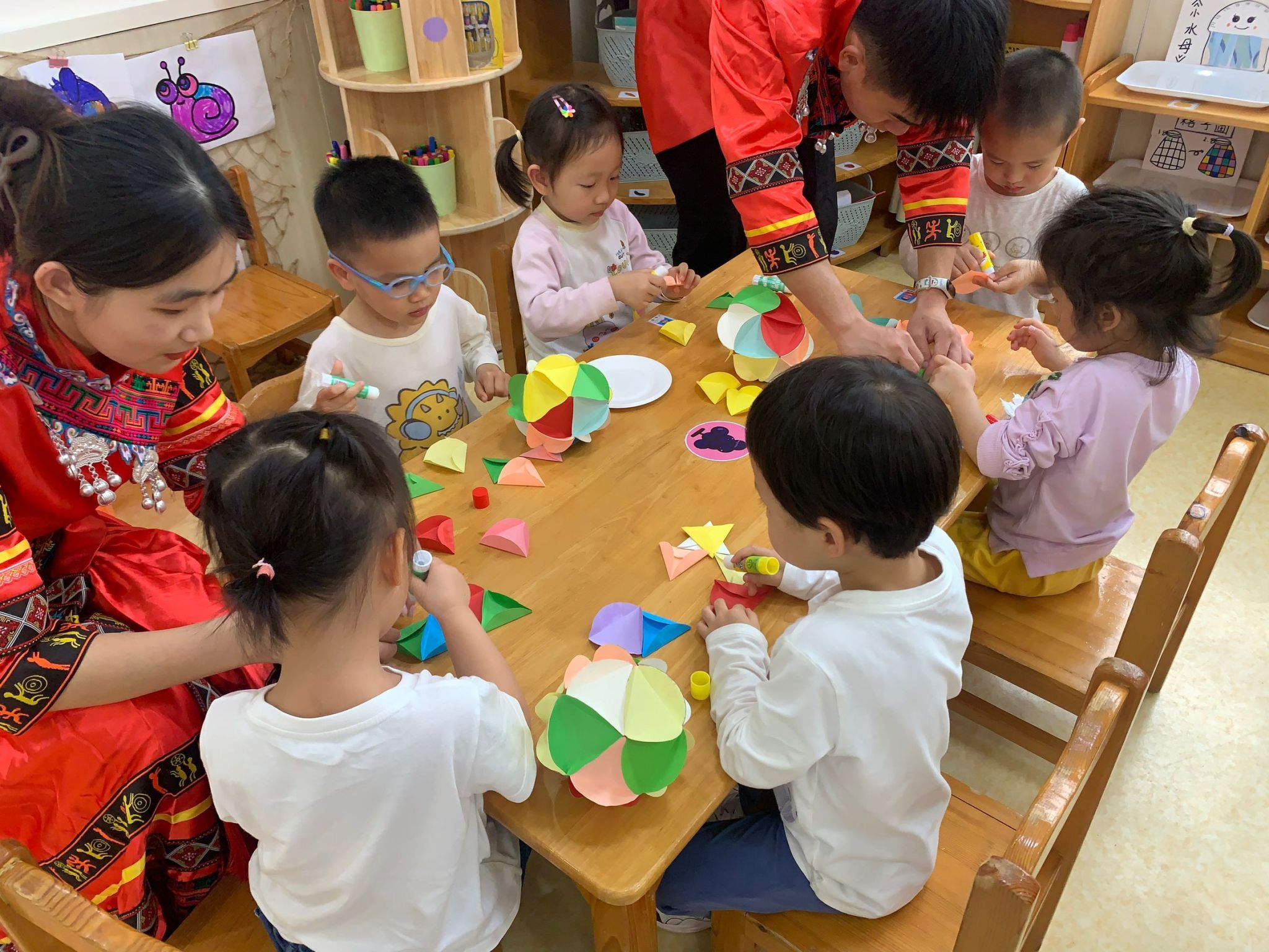 活动中,农植媚老师通过展示五色糯米饭、山歌对唱、竹竿舞等“广西三月三”传统习俗和壮族传统服饰,向小朋友们生动介绍了历史悠久的壮族文化生活,带领小朋友们感受民族节日的独特魅力。随后,支部党员韦立榕同志向小朋友们详细介绍了壮族铜鼓文化与绣球文化,并带领小朋友们制作手工绣球和手工铜鼓。在支部同志细心帮助下,小朋友们充分发挥想象力和创造力,制作出了绚丽多彩、各富特色的铜鼓和绣球。最后,小朋友们纷纷在“石榴籽心连心,民族团结一家亲”纸树上留下自己的印记,无数个小手印汇聚成了一棵“团结树”,以简单生动的形式呈现出各民族共同团结奋斗、共同繁荣发展的局面,让小朋友们更加深刻地感受“中华民族一家亲”的现实意义,不断铸牢中华民族共同体意识。
