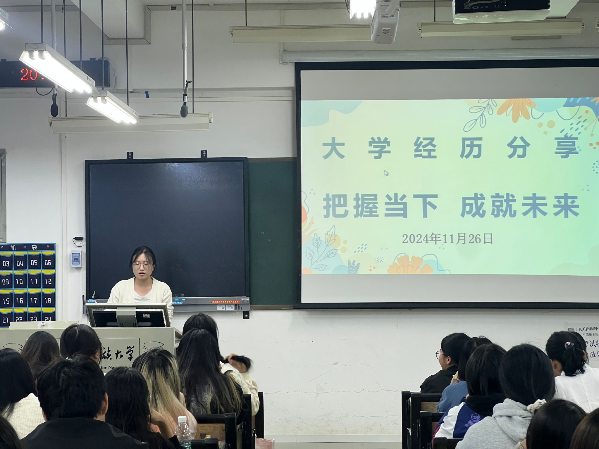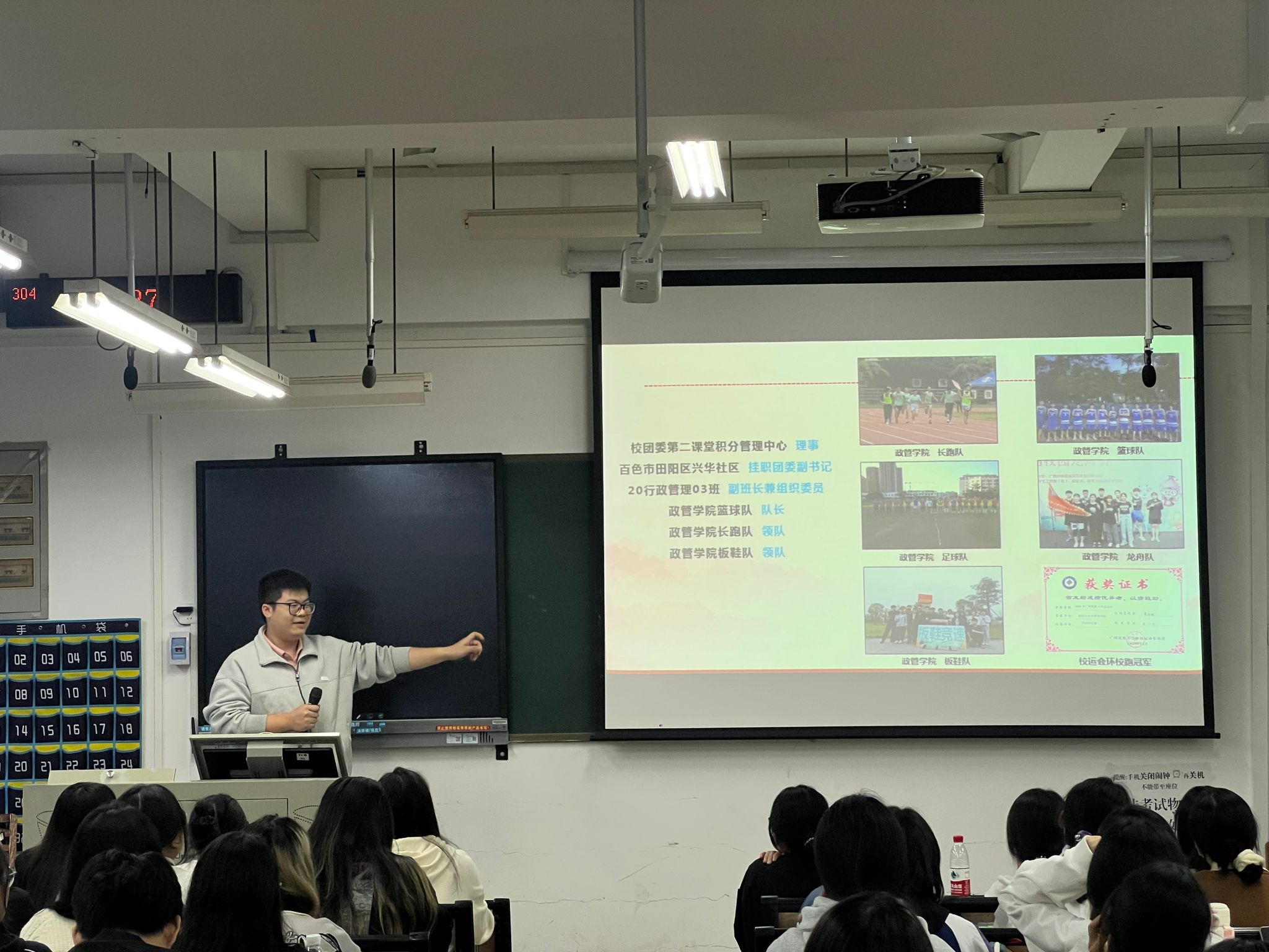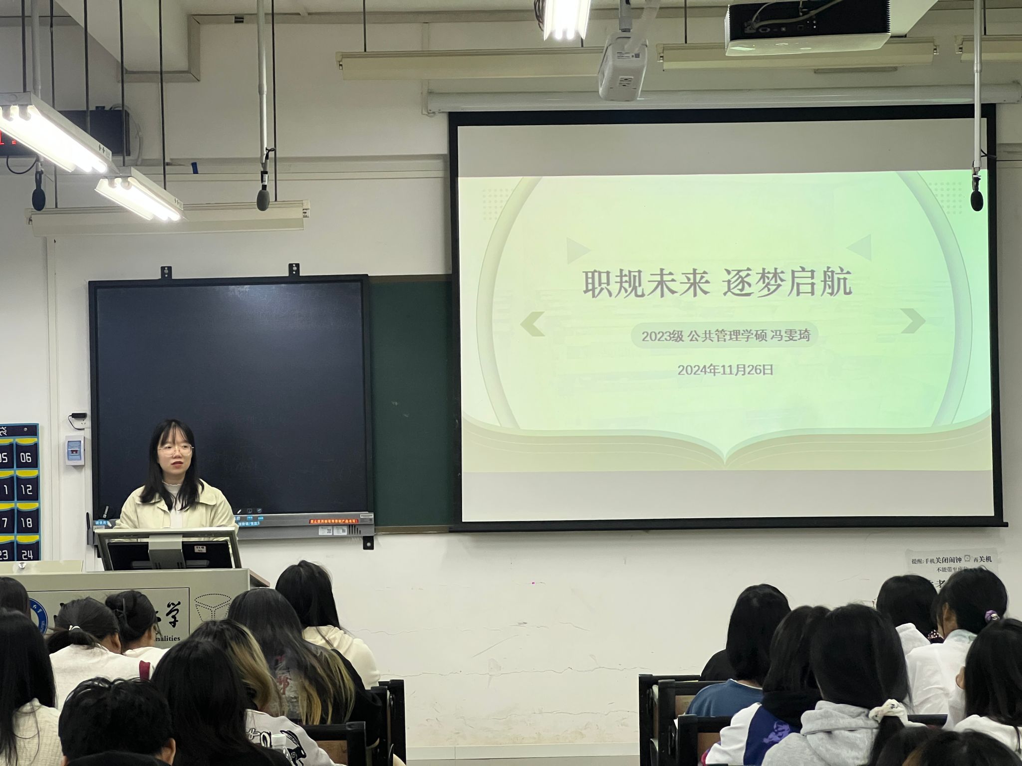 11月26日晚,政治与公共管理学院本科生第二党支部于学友楼304举办大学生职业生涯规划经验分享会,支部2024级全体新生参加此次分享会,分享会由支部书记农植媚主持。