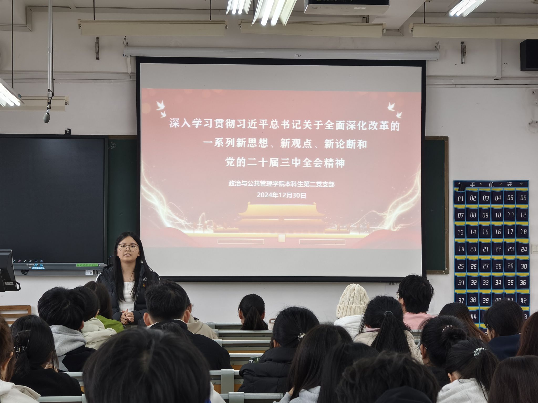 12月30日下午,m88明昇本科生第二党支部于学友楼606室召开学习贯彻党的二十届三中全会精神主题学习会,会议由吕佩原同志主持,支部书记农植媚及支部全体同志参加。