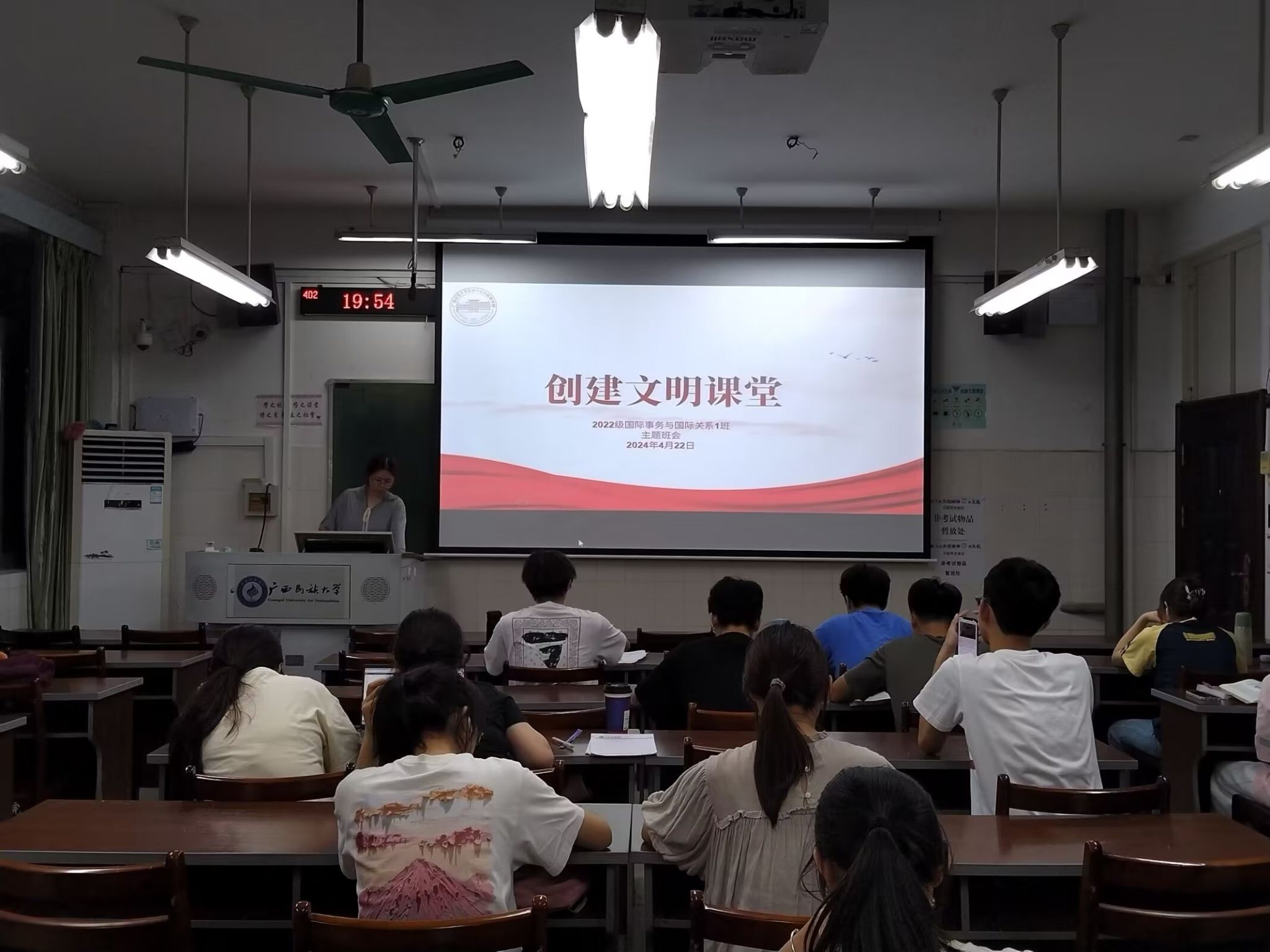 为加强校园文明建设,提高学生的文明素养,4月22日晚,2022级国际事务与国际关系1班于校友楼402教室开展“创建文明课堂”主题班会。会议由班长潘媛主持,2022级国际事务与国际关系1班全体同学参加。