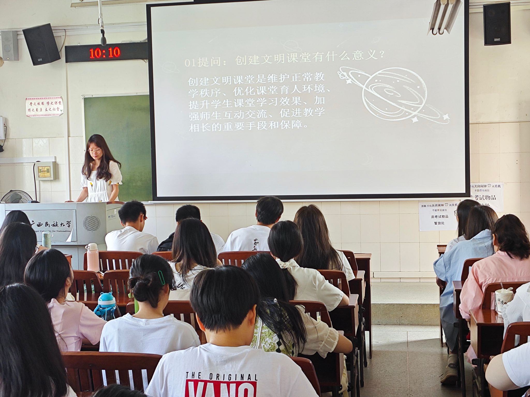 会议伊始,覃婷婷通过PPT展示,带领同学们了解了此次创建文明课堂的创建内容,强化同学们的“纪律红线意识”,引导同学们重视课堂学习过程,营造浓厚的学习氛围。随后,同学们从课堂礼仪、课堂秩序、课堂环境、学习风气四个方面学习了解了相关的创建标准。覃婷婷表示,同学们应文明修身,严格自律,提高综合素质,积极创建“干净整洁,明礼守纪,学风浓厚”的文明课堂。