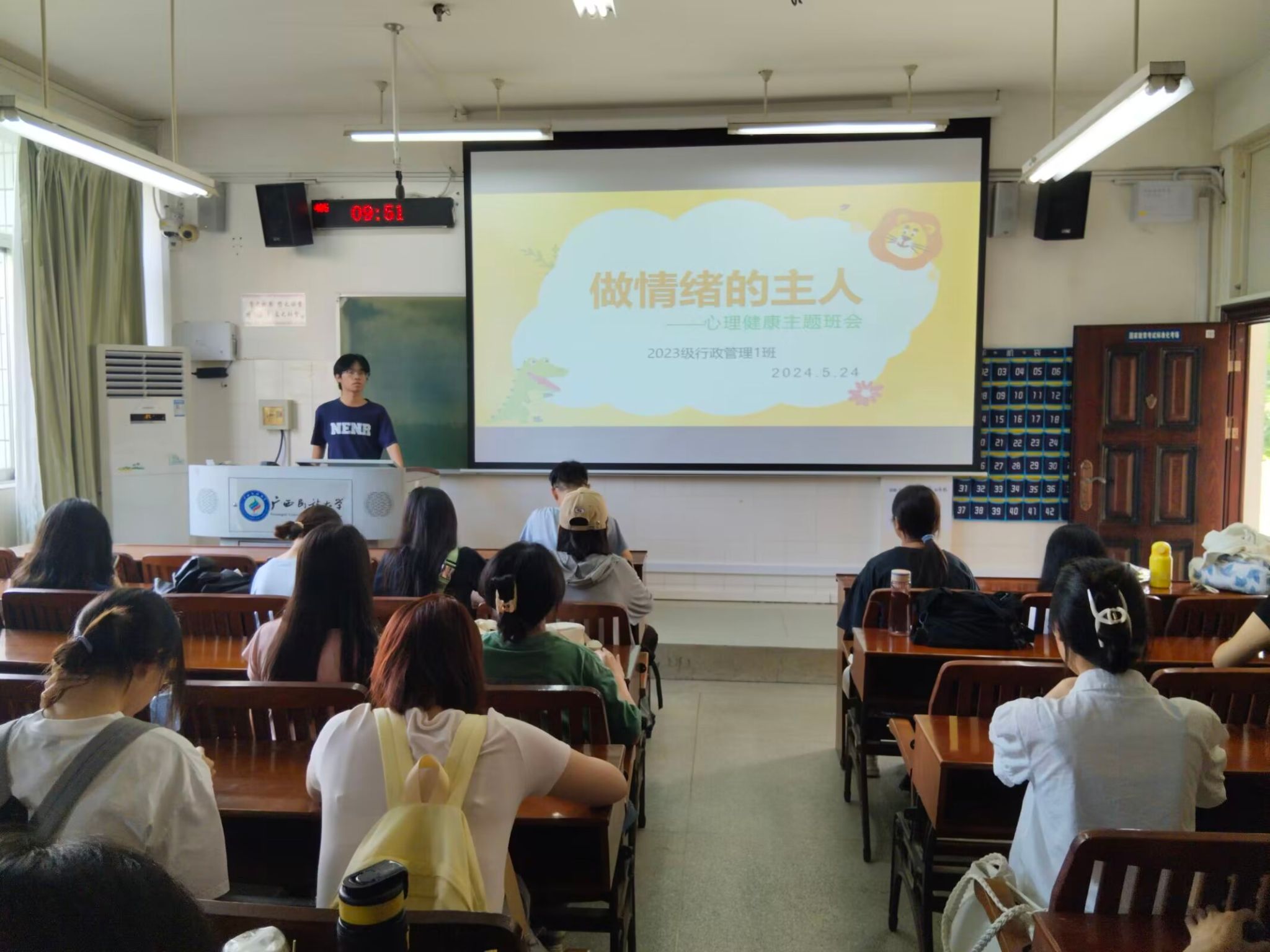 为加强大学生心理健康教育,培养同学们积极向上的健康心态,5月24日上午,2023级行政管理1班于校友楼405教室顺利开展主题为“做情绪的主人”心理健康教育主题班会。班级全体成员参会,班会由心理委员谢一玄主持。
