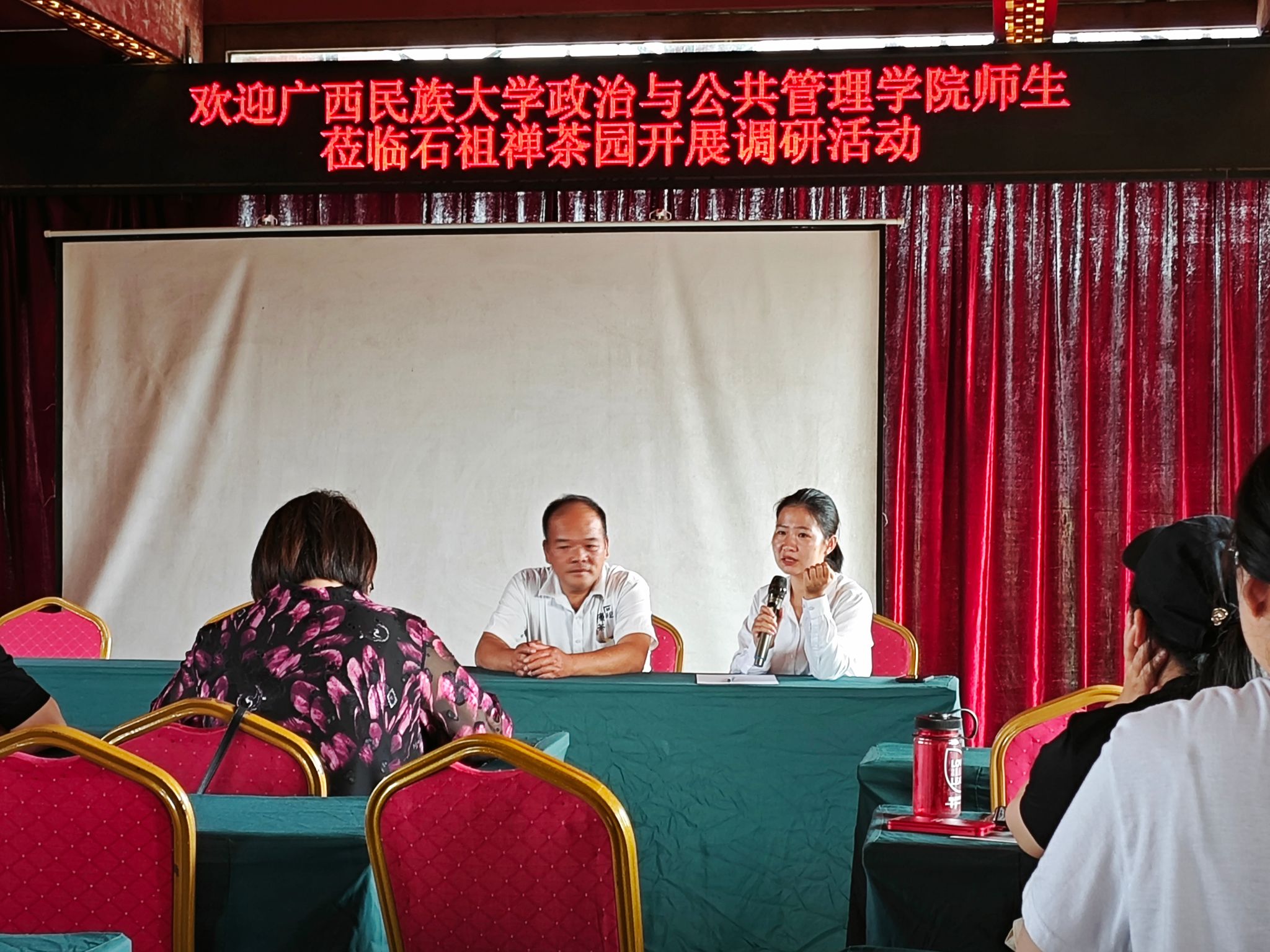 上午,调研组一行到石祖禅茶园参观调研。在讲解员的带领下,参观茶园种植基地。讲解员为师生介绍了茶园的发展历史、发展规模、当前园区经营情况,及其他相关产业的发展状况。园方还组织开展了与m88明昇师生互动交流的座谈会。会上,园方负责人回答了师生提出的关于乡村产业发展,产业收入分配,文旅项目发展情况,政企合作等相关问题。