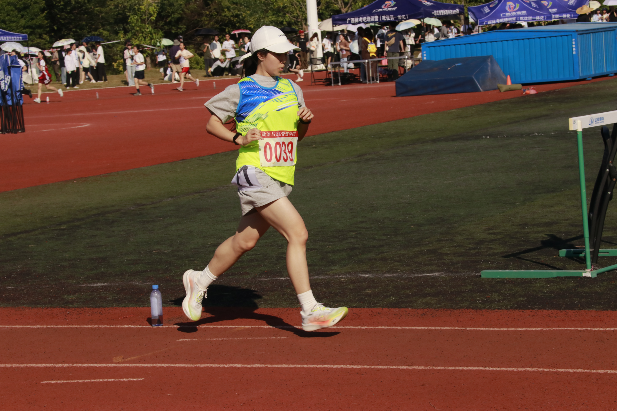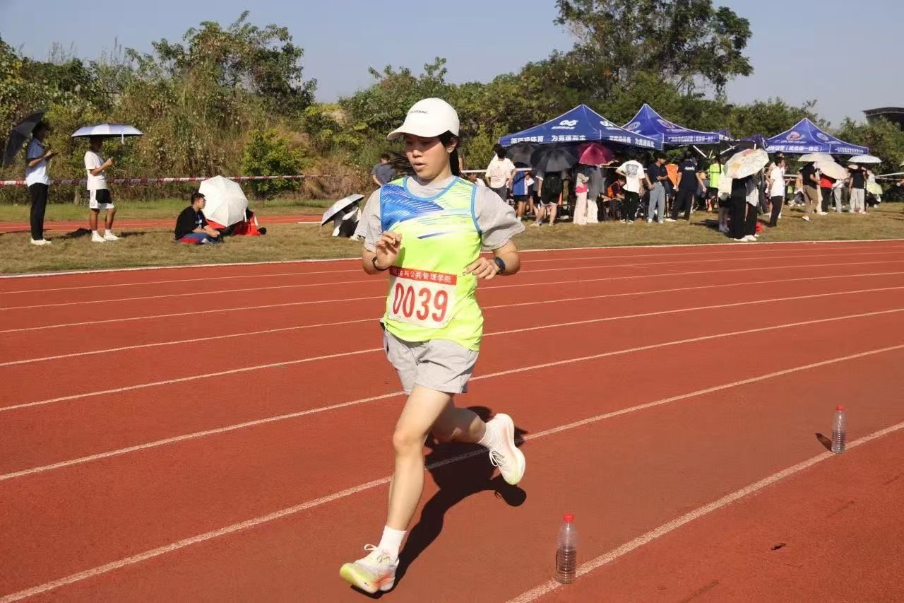 炽热的阳光下,运动场上仿佛被一层金色的纱幔笼罩着。廖晴晴在起点处准备就绪,她微微弓着身子,眼神果敢而坚毅地目视前方。“各就位—预备—跑!”随着一声枪响,廖晴晴干净利落地冲出起点线。第一圈,凭借着扎实功底,廖晴晴在一众运动员之中脱颖而出。到了第二圈,其他选手开始发力,但廖晴晴并没有受此影响,依然保持着自己的节奏。她抓住弯道机会持续发力,继续拉大与其他选手的距离。来到第三圈,廖晴晴已稍显疲惫,步伐越发沉重。“政管加油!政管加油!”响彻云霄的助威声伴着一阵阵有力的鼓声在操场上此起彼伏,廖晴晴身体仿佛被注入了强大力量。最后一百米,廖晴晴咬紧牙关,奋力摆动双臂,步伐愈发加快。“冲线了!”看台上的人们纷纷站起身来,挥舞着手中的彩旗,为她的胜利而欢呼雀跃。
