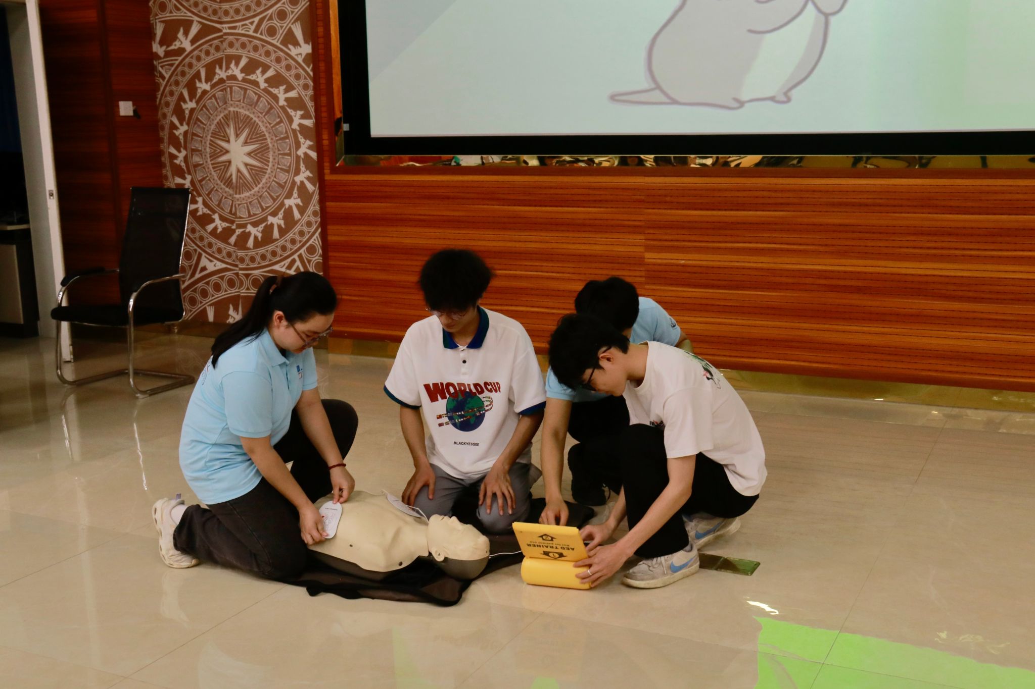 邕城水獭救护队队员邓志文同学结合应急救护知识宣教片,向大家介绍了学习掌握急救知识的重要性。邓志文结合实际场景和真实案例,深入浅出地为同学们讲解演示心肺复苏、AED(自动体外除擅器)及预防溺水急救知识和技能。