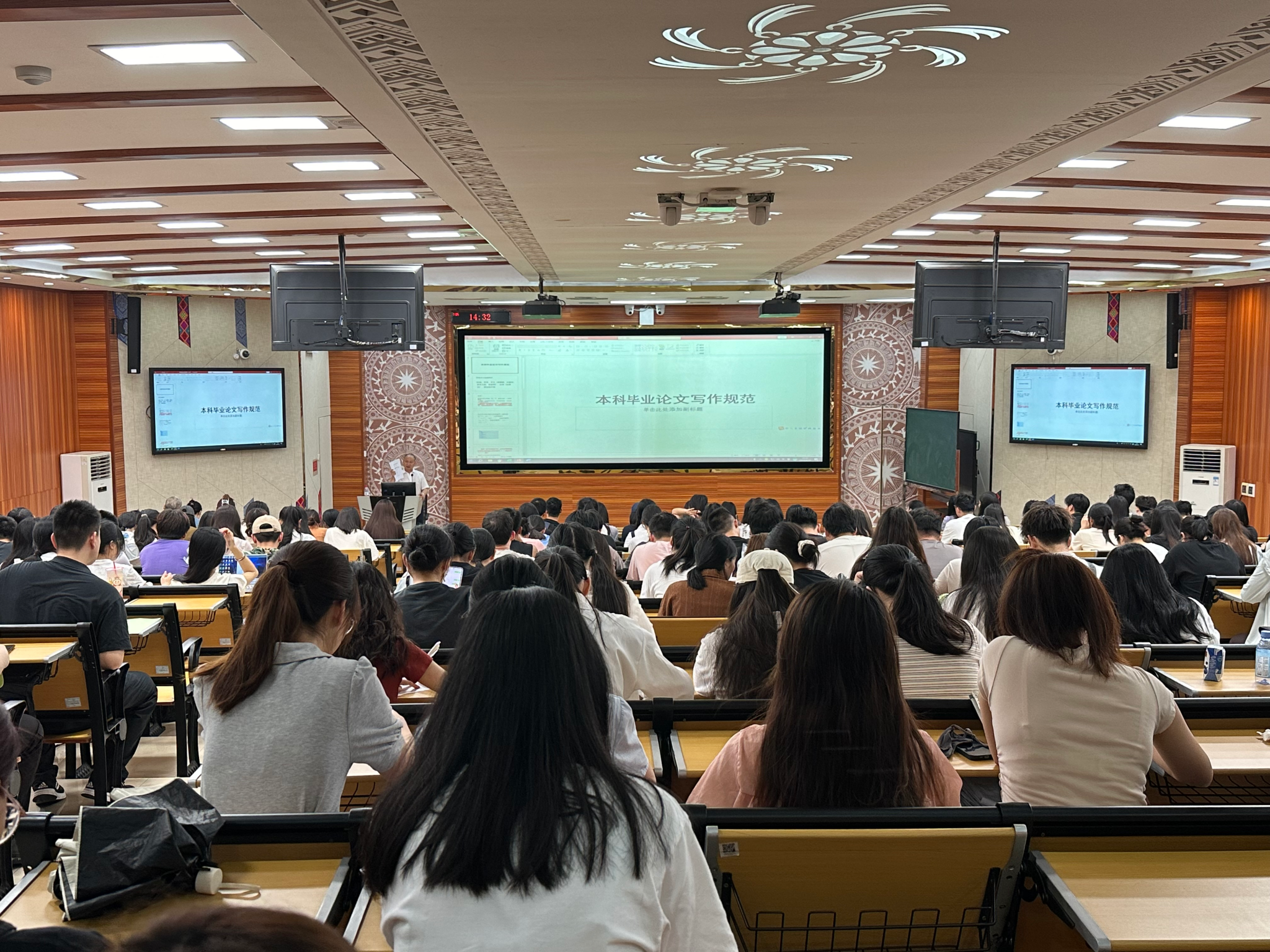 张爱民在会上结合近期毕业生在论文修改、论文答辩过程中出现的论文格式规范问题作了详细的讲解,解读了《广西民族大学2024届本科毕业论文(设计)写作规范》,结合目前大家普遍存在的问题对本科毕业论文的内容要求、引文标示、参考文献标注格式规范、打印装订要求等进行了重点解析。张爱民表示,一篇优秀的毕业论文不仅要有好的内容,也要有好的格式。规范的写作训练对同学们今后的学习和工作有着重要的作用和意义,希望同学们以严谨细致的态度,认真对待自己的毕业论文,及时与论文指导老师联系,完善论文写作方面的问题,自查自纠整改格式问题,确保论文顺利过关。